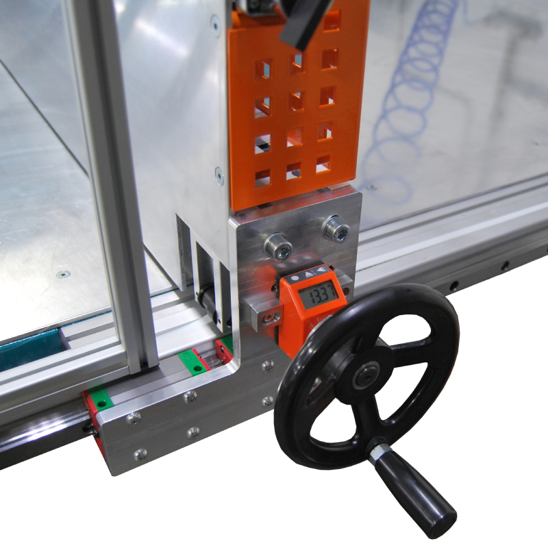 - Justerbar sidostopp / materialguide med digital skärm och ratt, pneumatiskt lås – hjälper till att göra exakta och upprepade snitt