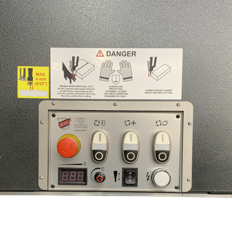 - Säker maskin – nödstopp, skyddskåpor med säkerhetsbrytare, teleskopkåpa över bladet med automatisk höjdjustering, nollspänningsutlösare
